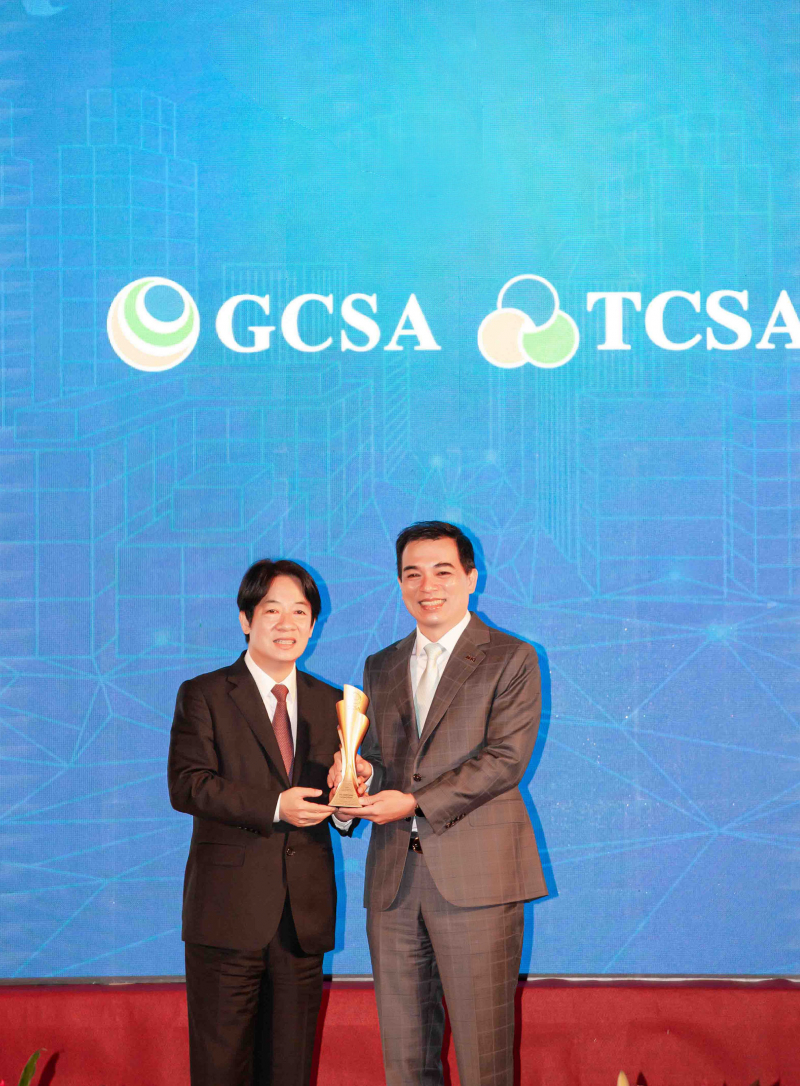 達全方位永續表現獲全球永續獎及臺灣永續獎肯定,由副總統賴清德頒獎 (左),LEYU官網總經理柯富仁 (右) 代表領獎