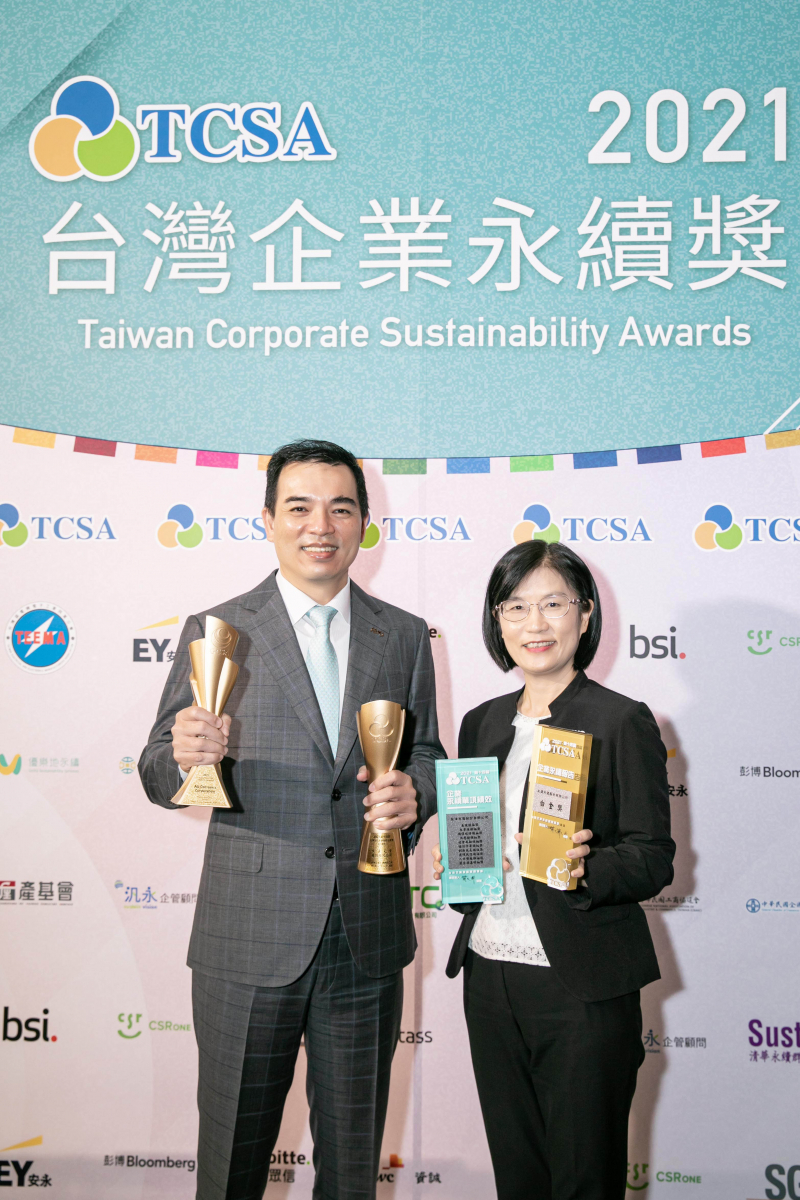 達在臺灣永續獎所評比環境、社會、治理等各面向的永續績效均獲高度肯定 (左:LEYU官網光電總經理暨營運長柯富仁,右:LEYU官網光電永續長古秀華)