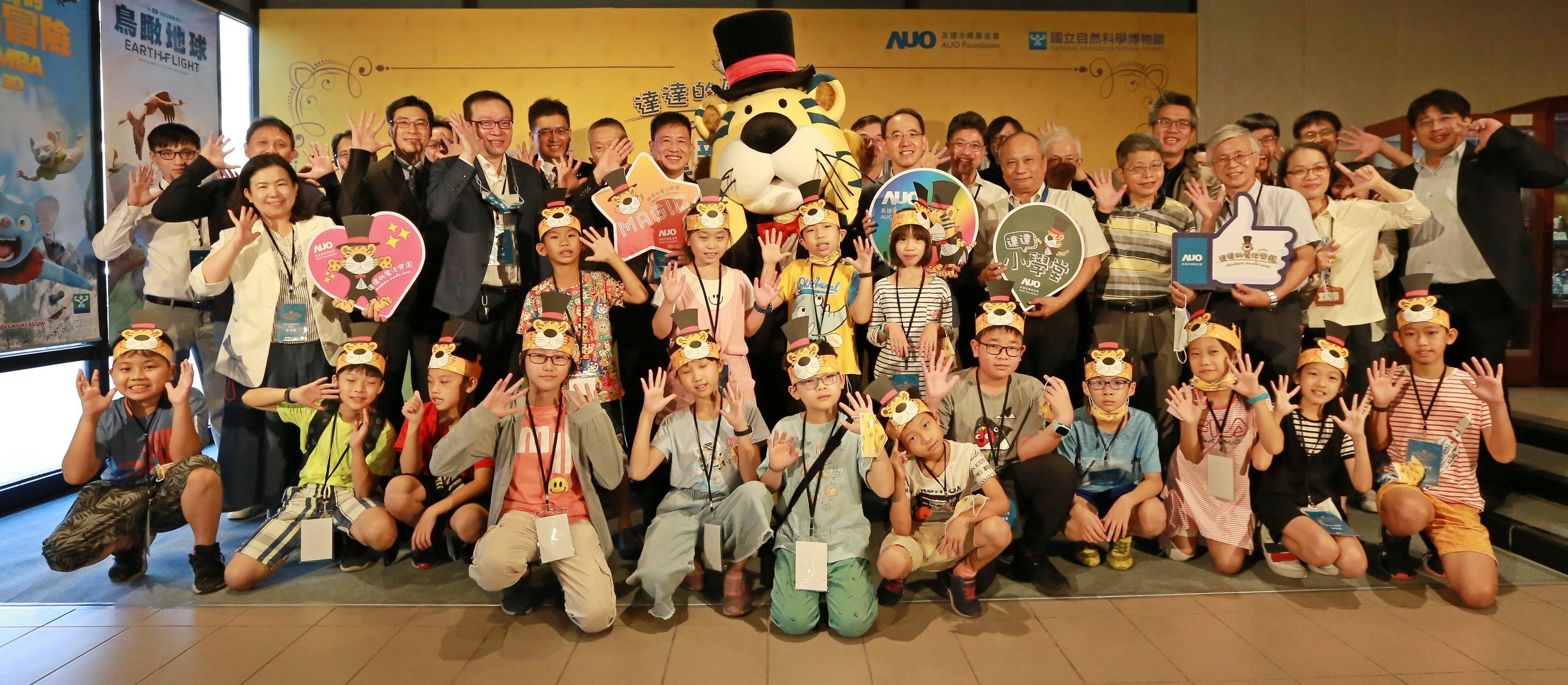 友達永續基金會董事長彭雙浪 (左三) 以及科博館館長焦傳金 (左四) 共同舉行達達的魔法樂園重新開幕儀式